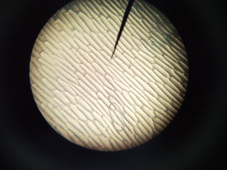 En la Cebolla se observa facilmente la membrana celular (esto es a un aumento de 10x) en un aumento de 40x la membrana se ve a mas detalle ademas se peude apreciar el nuclo de la celula; al realizar su tinsion con Azul de Metileno cada parte de la celula se pudo apreciar mejor